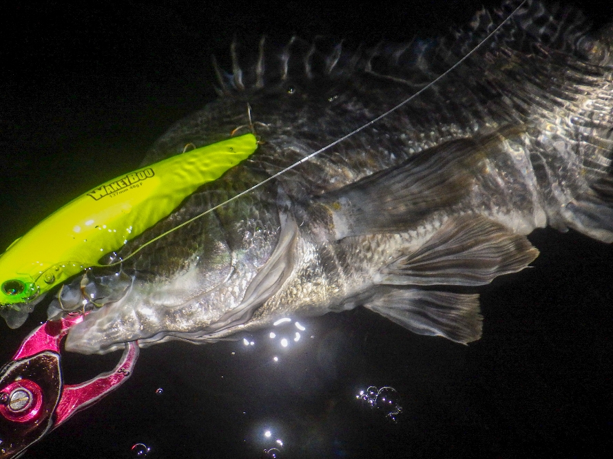 AM01:05の潮止まりから1時間半ほど過ぎ、再度ザワつき始めたところでルアーを変え、ようやくバイト。