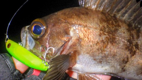 せめて、水の上にあれば良かったものの、水中に放置状態の『パンチライン60』にメバルが喰いつきやがった(笑)
