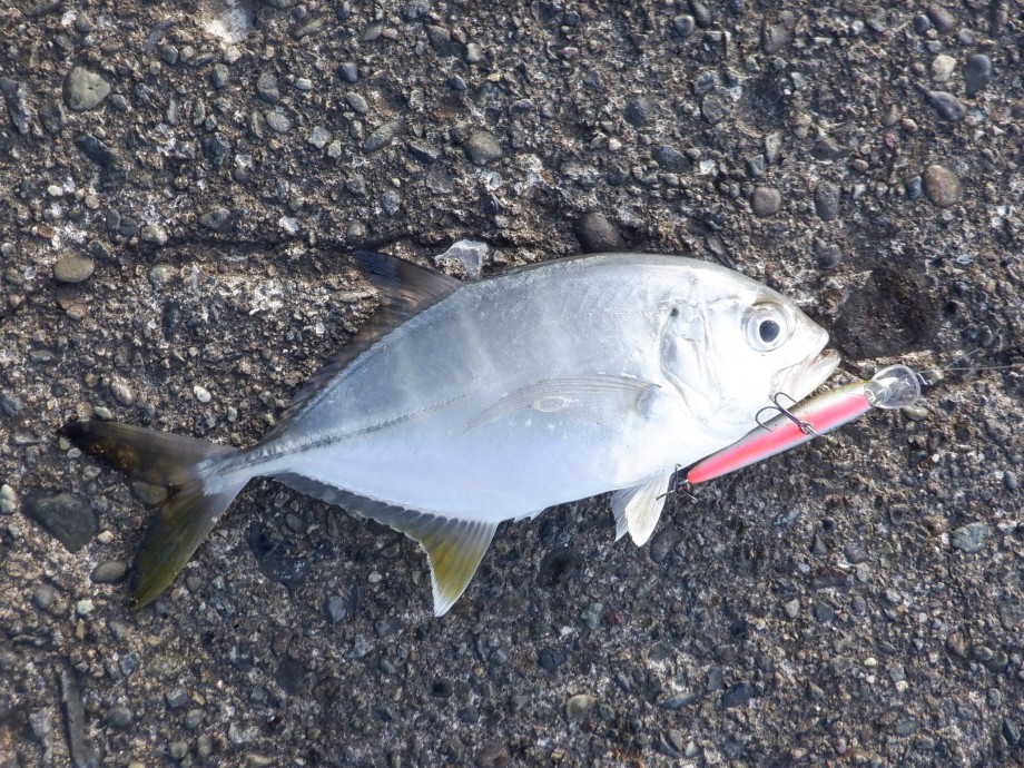 どうせすぐには釣れないだろうと高を括って、適当にトウィッチをしていたら、飛距離の半分くらいまでルアーが戻った辺りでガツン!とヒットしてびっくり!この魚は残念なことにバレてしまいましたが、気を抜いている時に限ってバイトが出るから不思議です。