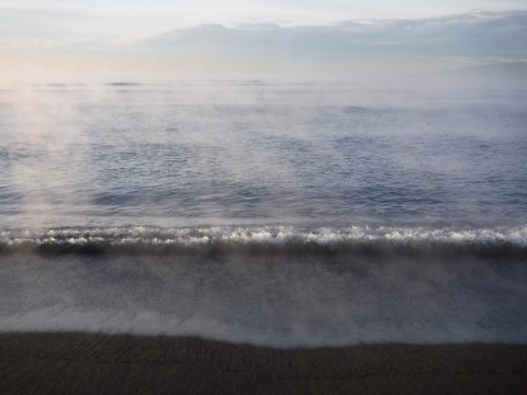車の中で確認していた外気温は2℃!まさに真冬の朝の気温です。寒がりな私は、ヒートテックのシャツを着こみ、ネックウォーマーを被り、さらにはお腹と背中にホカロンを入れるという用意周到さです。そして急いでウエーダーに履き替えていつもエントリーする護岸に来てみれば…それでも寒い!っで、海水温よりも極端に気温が低いために見られる“海霧”が発生していました。海が沸いているように見えます。幻想的な風景です。