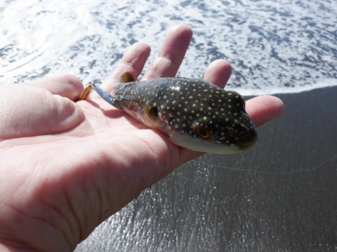 長いサーフを延々と打って行きますがなかなかバイトが出ません。そこでルアーをJackson/Pin tail tune 6にローテーション。より遠投を意識してサーチ。するとその数投目、ゴンッ!という鈍いバイトとともにヒット!こいつは先ほどの魚ほどではないけれど良く引きます。寄せ波に乗せてランディング。