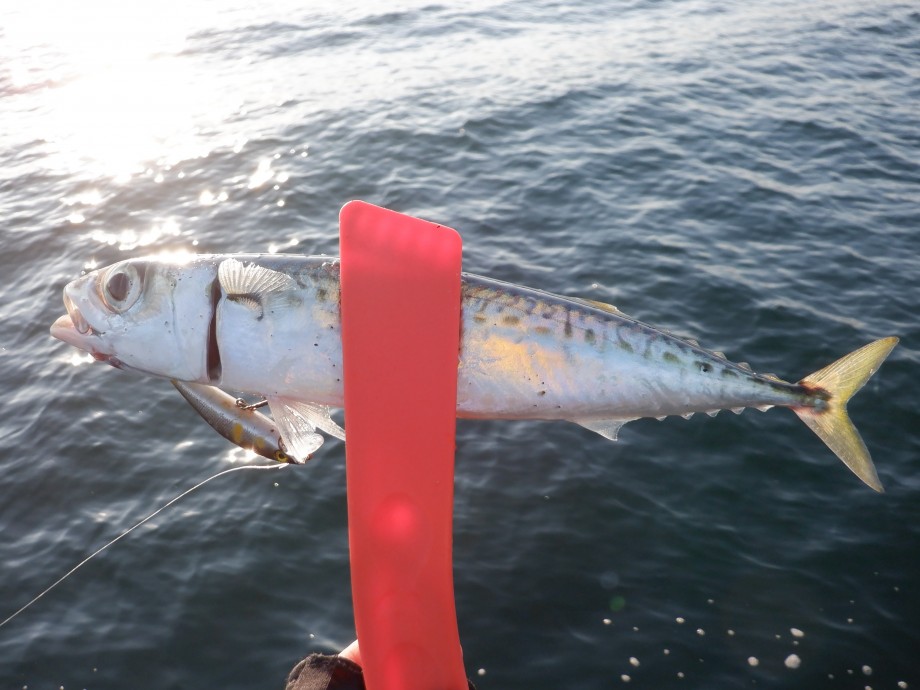 810さんは、何度かメッキをヒットさせるもほとんどがピックアップ直前でフックアウトしてしまい、ゲットできたのは1尾だけだとの事。その代わりサバが当たるそうです。何とサバが!…なんて思っていたら、私のミノーにも何者かがバイト。青物っぽい引き方だけど、何となく横走りするしメッキとは違うかな!?