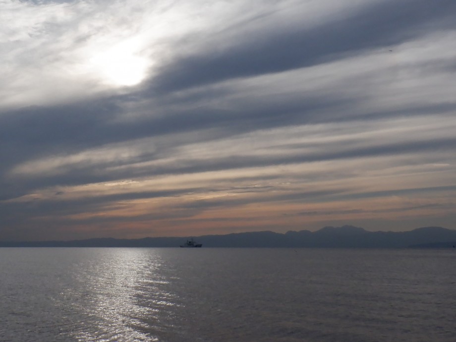 その後も状況は改善しません。時折ベイトフィッシュのトウゴロウイワシが暴れるので、何かがいそうな気がするのですが、ルアーには全く反応せず。そのうち日が傾いて、いよいよ寒くなってきました。その間、新たに訪れたアングラーが、シャローポイントでサクッと2尾釣りましたぞ!腕の差か!?