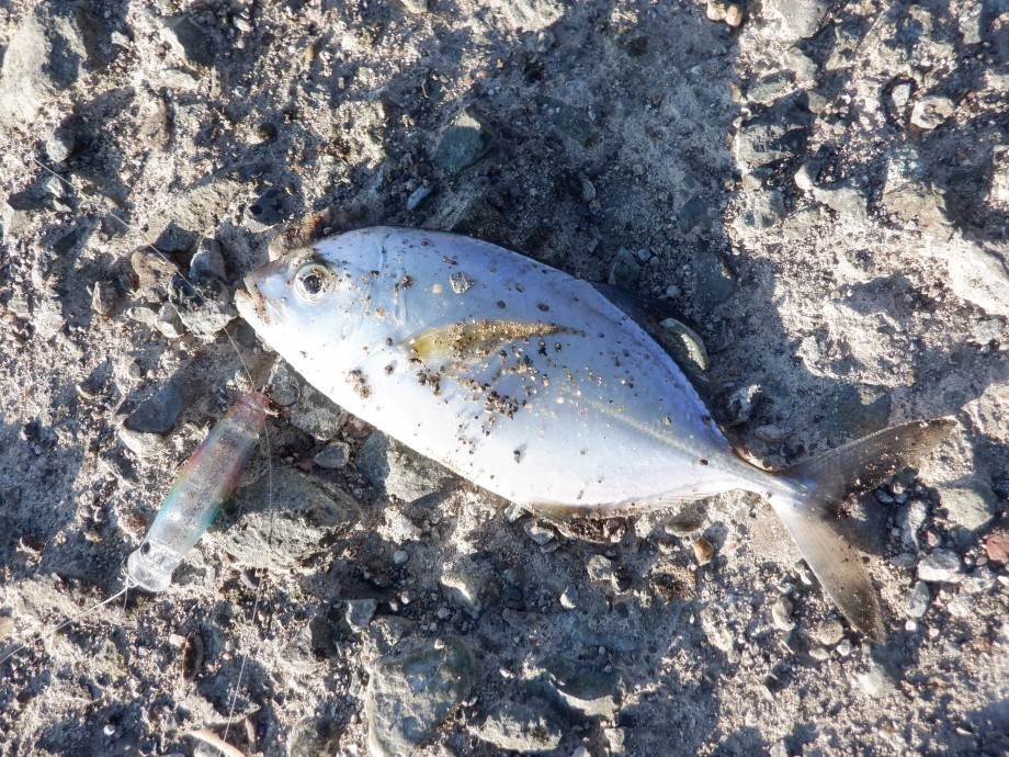 20㎝オーバーのギンガメッキでした。良かった良かった!これで日記に書くネタも整ったというものです。さらに同じ方角にフルキャストして、先ほどと同じような誘い方をすると、今度はジャーク後のフォールでじゃれつくようなバイトが出ました。そのままフッキングが決まって…