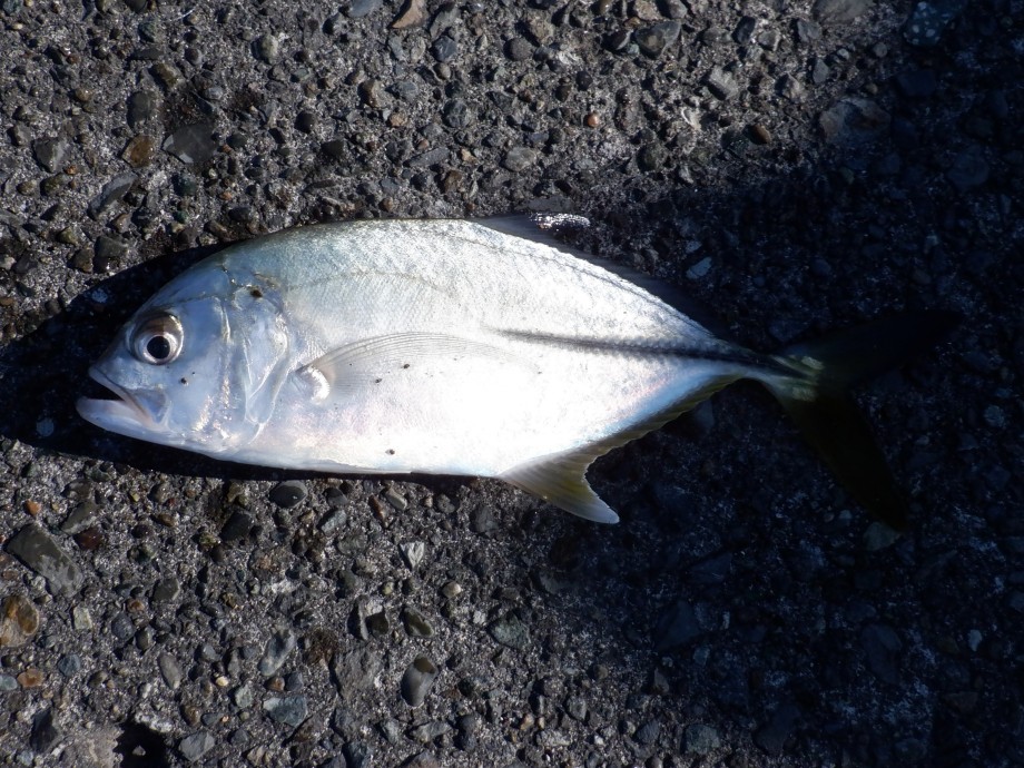 この日はちょっと早めの9:30頃に現地到着。昨日のポイントに入る前に、別の護岸を調査したくて数投してみたものの、全く反応が無いので諦め、昨日の護岸を目指します。既にAさんが釣っていました。そこへ丁度極楽とんぼさんも到着しました。早速昨日同様メタルジグ7gをフルキャスト。早々にバイトがあり、上がって来たのは…