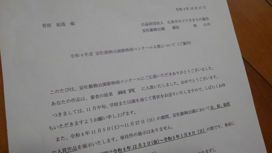 あ、そういえば最近の少し嬉しいニュースといえば『安佐動物公園動物画コンクール』の成人の部でトリッキー画伯の作品が銅賞に選出されました( ´ー`)