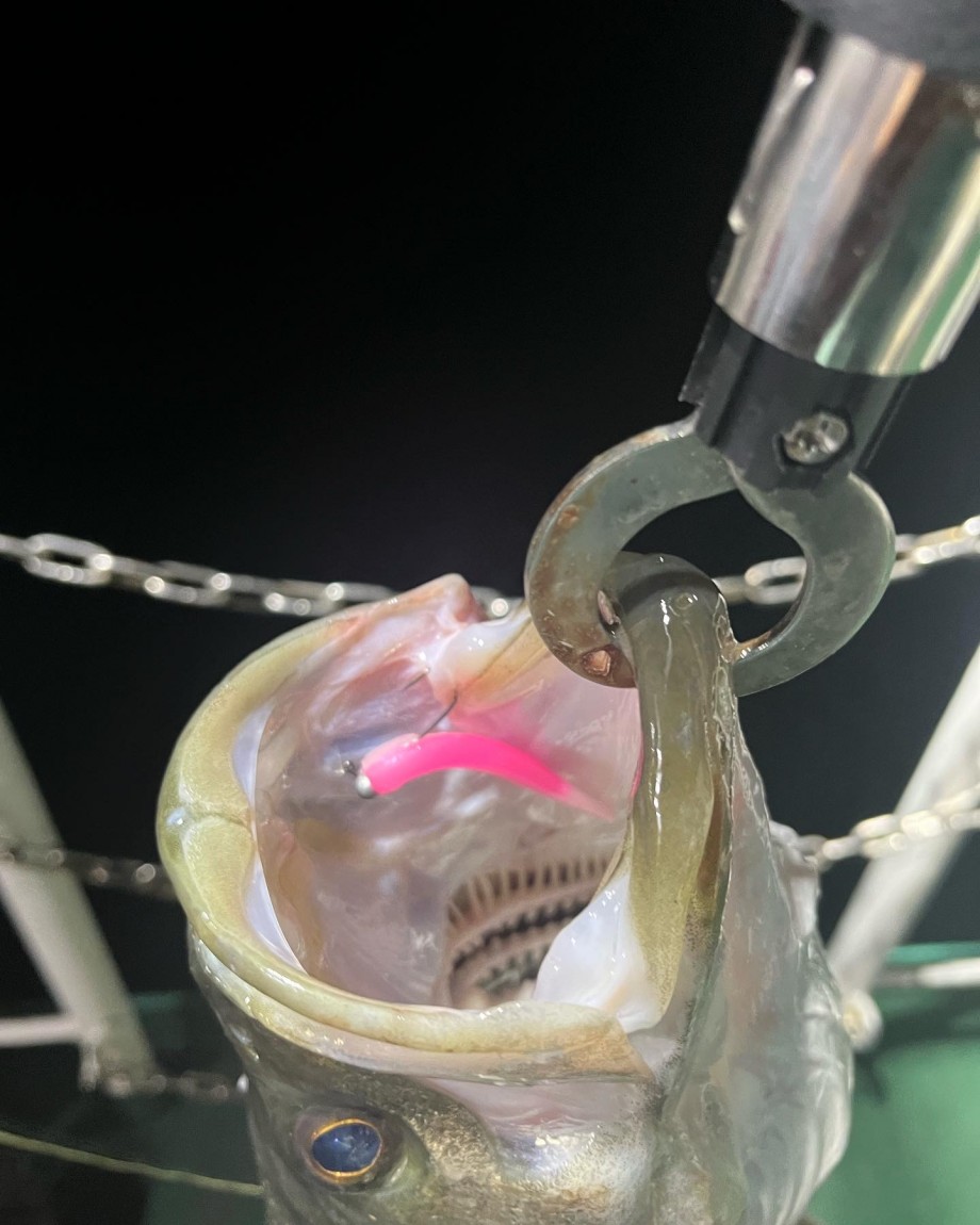 リーダーを細くすると見えシーバスでも食わせられると聞いたので、ミドルアッパー2.5インチにがまかつのジグヘッド1.8号で表層ゆっくり巻きで食いました。