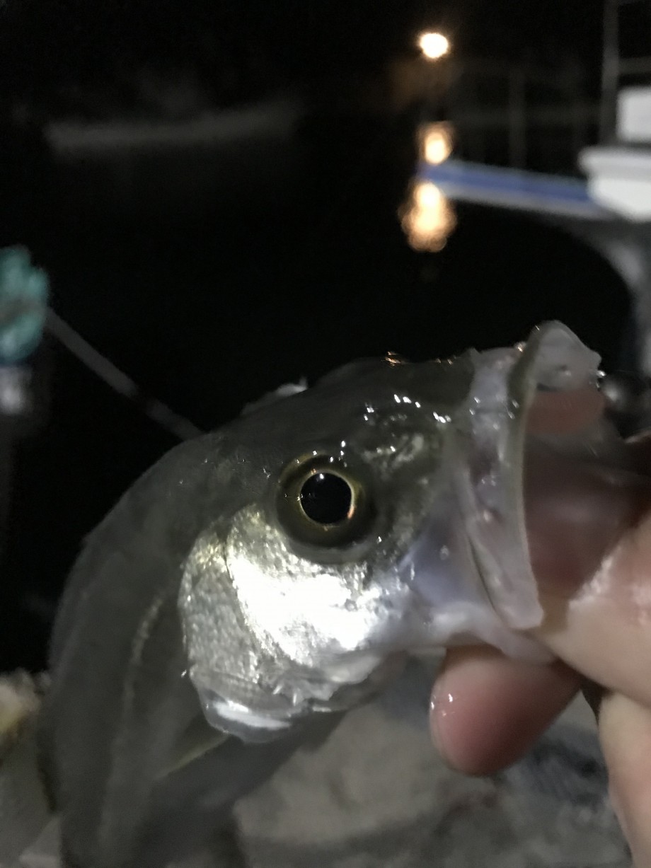 ルアーを水から引き上げて考え事(形状チェック)をしていると、常夜灯の灯りの中で、なんだか知らないけど小さい魚がたまにライズするのが見えた。
