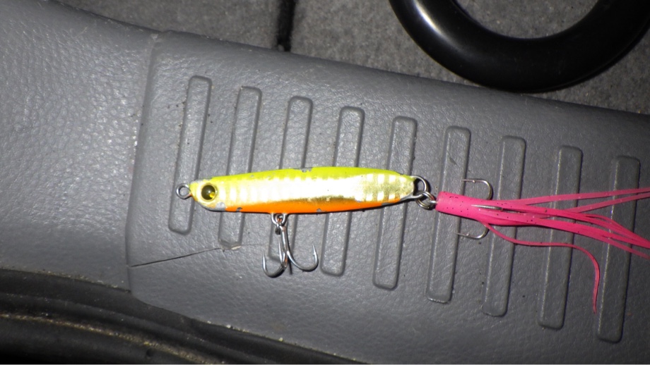 スローリトリーブでちょんちょんアクションさせながら巻いて止めた後のカーブフォールでカッとはじくバイト