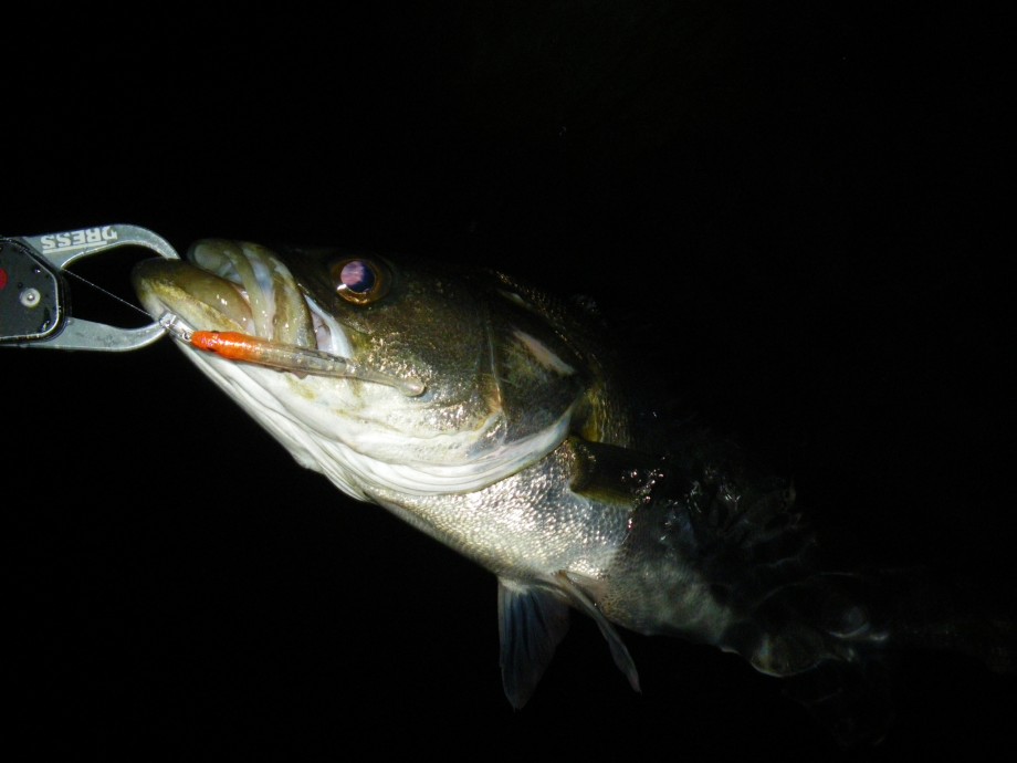 そうこうしているとアタリが遠のき、逃げ惑うベイトが騒がしくなってシーバスの気配がでてきたのでルアーをチェンジ。
