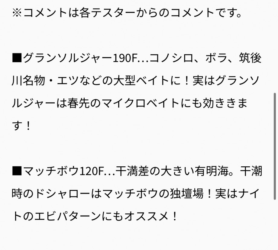 各テスターからセット内容のルアーの特徴やオススメの使い方のコメント付き!!