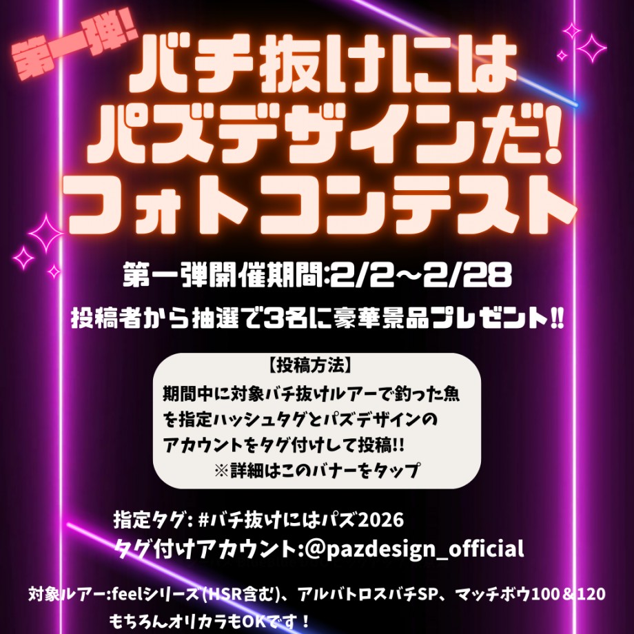 キャンペーン期間中に対象ルアーで釣った魚を指定ハッシュタグとパズデザインのアカウントにタグ付けしてインスタグラムに投稿してください。